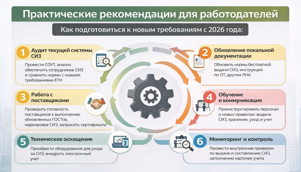 Чтобы изменения с 2026 года прошли максимально безболезненно, работодателям и специалистам по охране труда стоит заранее предпринять ряд шагов. Ниже представлен чек-лист рекомендаций, который поможет подготовиться к новым требованиям на практике:- Аудит текущей системы СИЗ. Проанализируйте, как сейчас организована выдача спецодежды в вашей компании. Сверьте действующие нормы с Едиными типовыми нормами (приказ № 767н) – все ли требуемые СИЗ включены. Проверьте, по всем ли рабочим местам проведена СОУТ и оценка рисков; если нет – организуйте эти процедуры, они стали основой для обеспечения СИЗ.